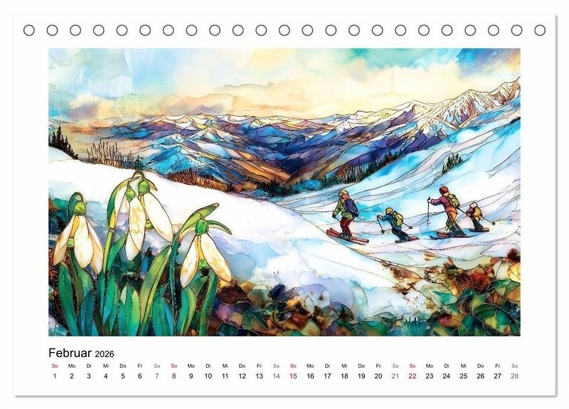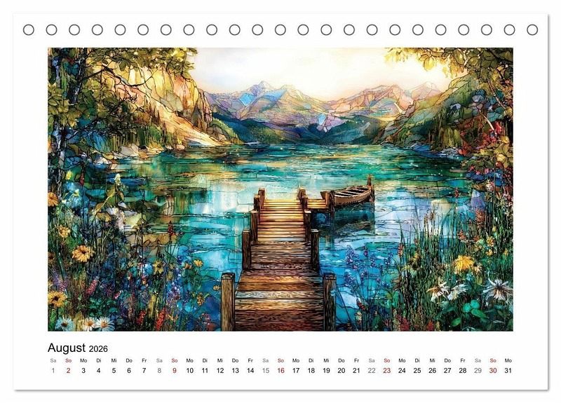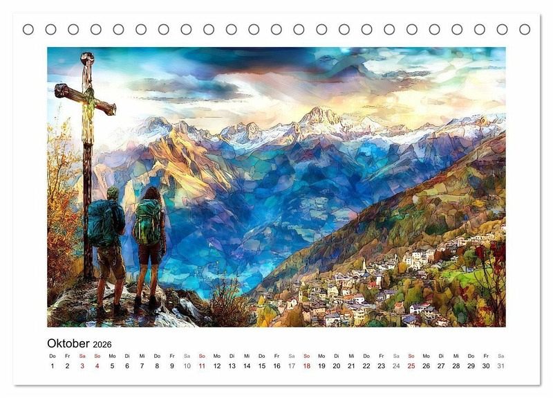 Erleben Sie mit diesem Kalender die majestätische Schönheit der Berge. Die kunstvollen Bergansichten lassen Gipfel, Täler und Himmel in bunten, gläsern schimmernden Farben erstrahlen. Jeder Monat ist ein mit Hilfe von KI kreiertes Kunstwerk, das leuchtet, lebt und voller Licht ist wie ein Fenster aus Glasmalerei, das die Seele berührt.