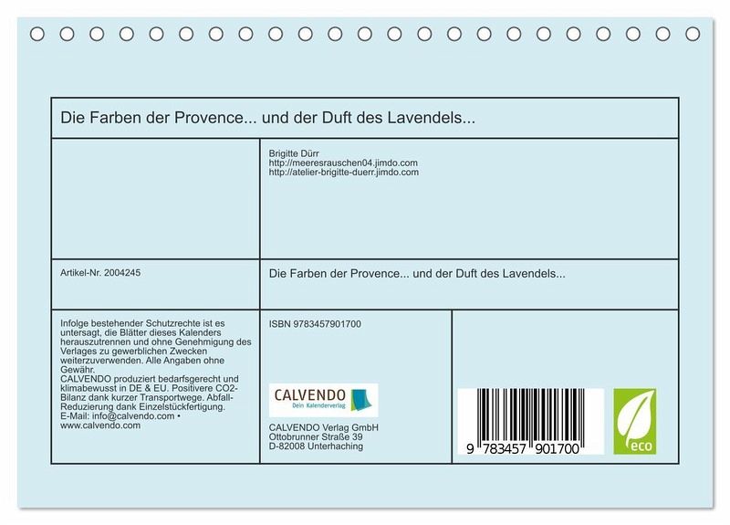 QUALITÄT - Hochwertiger Fotokalender mit 12 wunderschönen Motiven auf lichtbeständigem Bilderdruckpapier, robuste Spiralbindung.NACHHALTIG - deutliche Abfallreduzierung durch bedarfsgerechte Einzelstückfertigung, umweltfreundliches FSC-zertifiziertes Papier, Produktion in Deutschland, klimabewusste Logistik.PERFEKTES GESCHENK - Kalender für Freunde und Familie, für Kinder und Erwachsene, jung und alt, zu Weihnachten, Geburtstag oder zwischendurch.VIELFALT - Bildkalender in verschiedenen Formaten, z.B. DIN A5, DIN A4, DIN A3 sowie DIN A2. Ob Naturmotiv, Gemälde oder Fotos, ideal für ein persönliches Wohlfühlambiente.Tiefesonnige Farben vermitteln den Duft und das Licht der Provence von Autor(in): Brigitte Dürr