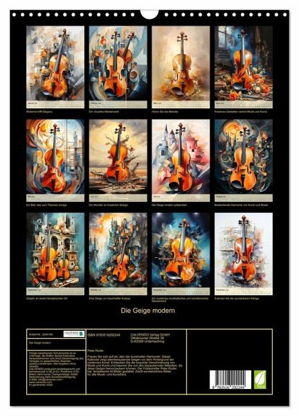 Freuen Sie sich auf ein Jahr der kunstvollen Harmonie! Dieser Kalender zeigt atemberaubende Geigen vor dem Hintergrund der modernen Kunst. Entdecken Sie die exquisite Verschmelzung von Musik und Kunst und träumen Sie von den bezaubernden Melodien, die diese Geigen hervorzaubern können. Der Fotokünstler Peter Roder hat fantastische KI-Bilder gestaltet. Zwölf wunderschöne Bilder für alle Musik- und Kunstfans.