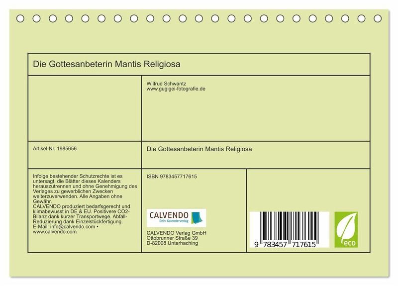 QUALITÄT - Hochwertiger Fotokalender mit 12 wunderschönen Motiven auf lichtbeständigem Bilderdruckpapier, robuste Spiralbindung.NACHHALTIG - deutliche Abfallreduzierung durch bedarfsgerechte Einzelstückfertigung, umweltfreundliches FSC-zertifiziertes Papier, Produktion in Deutschland, klimabewusste Logistik.PERFEKTES GESCHENK - Kalender für Freunde und Familie, für Kinder und Erwachsene, jung und alt, zu Weihnachten, Geburtstag oder zwischendurch.VIELFALT - Bildkalender in verschiedenen Formaten, z.B. DIN A5, DIN A4, DIN A3 sowie DIN A2. Ob Naturmotiv, Gemälde oder Fotos, ideal für ein persönliches Wohlfühlambiente.Die Europäische Gottesanbeterin - faszinierend und wunderschön - Insekt des Jahres 2017 von Autor(in): GUGIGEI
