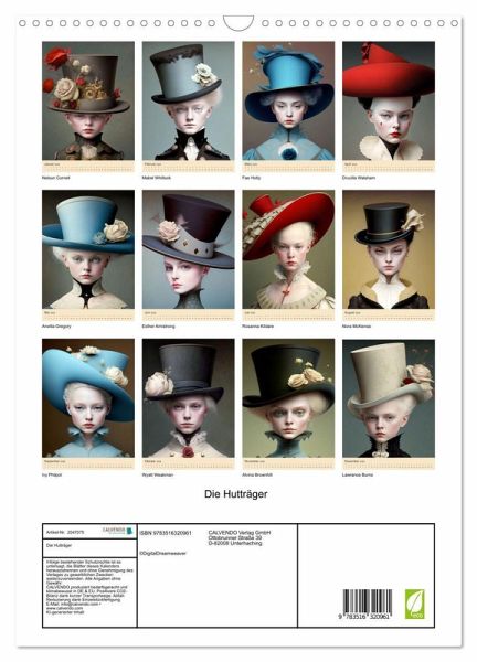 Tauchen Sie ein in die faszinierende Welt der Viktorianischen Zeit mit dem einzigartigen Kalenderprojekt von DigitalDreamweaver: 'Die Hutträger - Portraits aus der Viktorianischen Zeit'. Dieser exquisit gestaltete Kalender präsentiert zwölf kunstvolle Portraits von jungen Menschen, die mit stolz getragenen Hüten die Essenz dieser Ära einfangen.Jedes Bild erzählt eine eigene Geschichte und fängt die Atmosphäre und den Charme vergangener Zeiten ein. Von eleganten Damen bis zu galanten Herren - die Hutträger entführen Sie in eine Welt voller Geheimnisse, Eleganz und Stil. Durch die Verwendung der innovativen Midjourney-Technologie wurden diese fesselnden Portraits mit Liebe zum Detail geschaffen, ohne auf konkrete Personen zurückzugreifen.Dieser Kalender ist nicht nur ein visuelles Vergnügen, sondern auch ein Sammlerstück für Liebhaber der viktorianischen Ära, Kunstenthusiasten und Geschichtsinteressierte. Hängen Sie ihn in Ihrem Zuhause oder Büro auf und lassen Sie sich von der zeitlosen Schönheit der Hutträger verzaubern.Erleben Sie die Magie der Viktorianischen Zeit, eingefangen in einem einzigen Kalender. Sichern Sie sich noch heute Ihren eigenen 'Die Hutträger - Portraits aus der Viktorianischen Zeit'-Kalender und genießen Sie ein Jahr voller Nostalgie, Stil und Geschichte.