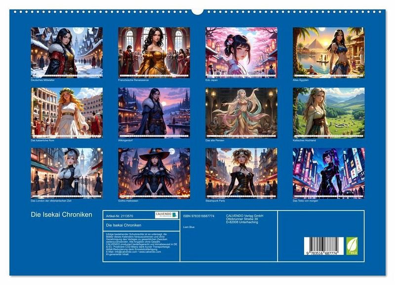 Mach dich mit unserem KI-generierten Isekai-Anime-Kalender auf eine Reise durch Zeit und Fantasie! Jeder Monat zeigt eine atemberaubende Szene: eine wunderschöne Anime-Heldin vor detailreichen Hintergründen, die von Epochen vom mittelalterlichen Deutschland bis zum futuristischen Cyber-Tokio inspiriert sind. Erlebe verzauberte Schlösser, lebhafte Renaissance-Märkte, geheimnisvolle viktorianische Straßen und schillernde Feste aus der Edo-Zeit - jedes Bild ist ein lebendiges Wimmelbild, voller versteckter Details und Geschichtenpotenzial. Perfekt für Fans von Abenteuer, Geschichte und Anime-Kunst. Mach jeden Tag zu einem magischen Erlebnis mit einem Kalender, der dich einlädt, immer wieder neue Welten zu entdecken!