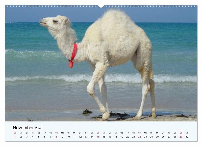 November: Ein weißes Dromedar am Strand