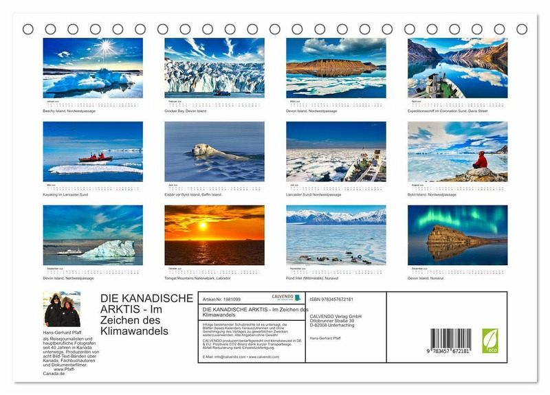 Die Magie und die Schönheit der Arktis gehört, trotz des allgegenwärtigen Klimawandels, zu den eindrucksvollsten Regionen unserer Erde. Mit aktuellen Fotos haben die Reise-Fotografen Elvira und Hans-Gerhard Pfaff das dramatisch zurückgehende Polareis in der berühmten Nordwest-Passage auf 12 Kalenderblättern dokumentiert. Ein Muss für jeden Liebhaber der eisigen Welten.