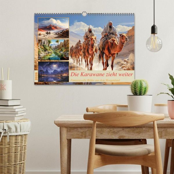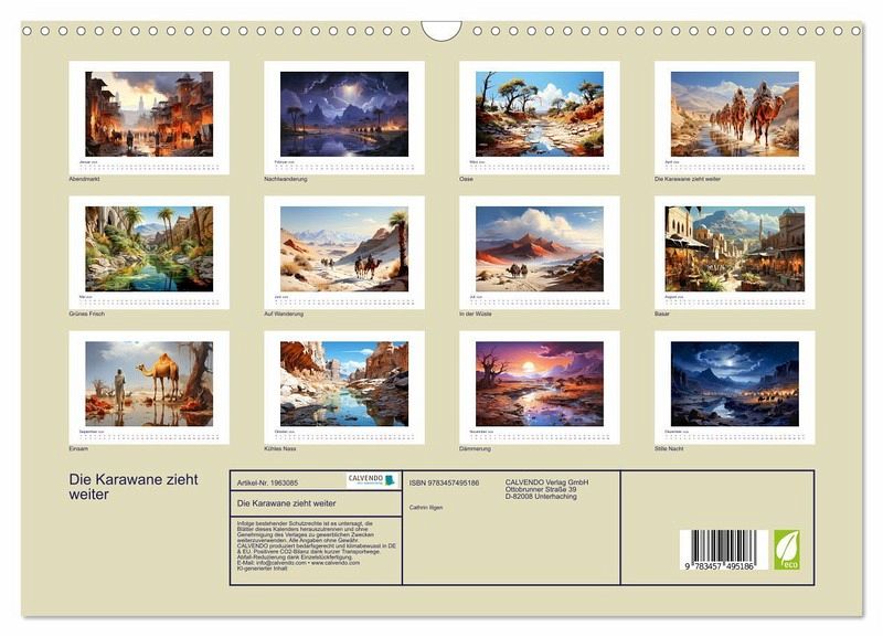 Der neue KI-Kalender zeigt fantasievolle Zeichnungen aus der Welt des Morgenlandes mit seinen exotischen Landschaften, seinen majestätischen Kamelen, die in Karawanen durch das Land ziehen und seiner geheimnisvollen Atmosphäre. Lassen Sie sich von der Schönheit und dem Zauber dieser Kunstwerke verzaubern und inspirieren. Dieser Kalender ist nicht nur ein praktischer Begleiter für das ganze Jahr, sondern auch ein echter Hingucker für Ihr Zuhause oder Büro.