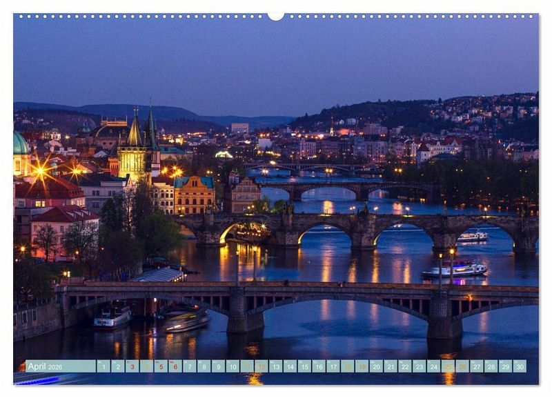 April: Die Brücken von Prag über der Moldau, zur Blauen Stunde