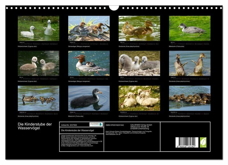 Der Kalender widmet sich der Kinderstube der Wasservögel. Dabei aind der bekannte Höckerschwan, die Stockente, das Blässhuhn und der weniger bekannte Gänsesäger vertreten. Jedes Jungtier einer Vogelart hat ihr individuelles Vogelkleid. Es ist zum Beispiel nur schwer vorstellbar, dass aus einem unscheinbaren, grauen Küken mal ein stolzer Schwan werden kann. Der Kalender soll einen kleinen Einblick in das Leben der Wasservogel Küken zeigen.