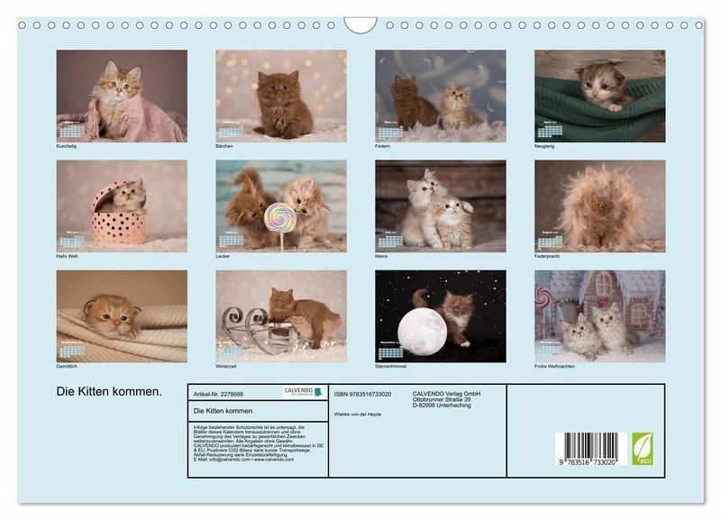 QUALITÄT - Hochwertiger Fotokalender mit 12 wunderschönen Motiven auf lichtbeständigem Bilderdruckpapier, robuste Spiralbindung mit Aufhängebügel.NACHHALTIG - deutliche Abfallreduzierung durch bedarfsgerechte Einzelstückfertigung, umweltfreundliches FSC-zertifiziertes Papier, Produktion in Deutschland, klimabewusste Logistik.PERFEKTES GESCHENK - Kalender für Freunde und Familie, für Kinder und Erwachsene, jung und alt, zu Weihnachten, Geburtstag oder zwischendurch.VIELFALT - Bildkalender in verschiedenen Formaten, z.B. DIN A5, DIN A4, DIN A3 sowie DIN A2. Ob Naturmotiv, Gemälde oder Fotos, ideal für ein persönliches Wohlfühlambiente.Verschiedene Deutsch Langhaar Kitten von Autor(in): Wiebke von der Heyde