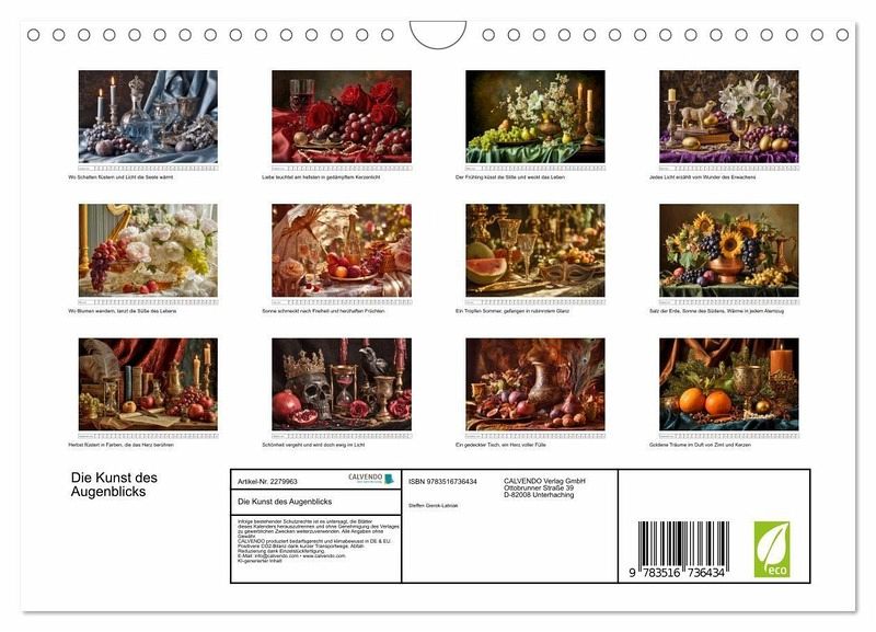 Tauchen Sie ein in eine Welt, in der Kerzen flüstern, Gold schimmert und Zeit fast stillzustehen scheint.Dieser Kalender ist mehr als ein Blickfang. Er ist ein Gefühl. Warm, sinnlich, reich an Tiefe und Emotion. Jede Seite ein Kunstwerk. Jeder Monat ein stiller Moment voller Fülle. Für Menschen, die Schönheit lieben, Stille schätzen und sich jeden Tag ein Stück alte Meister in ihr Zuhause holen möchten.