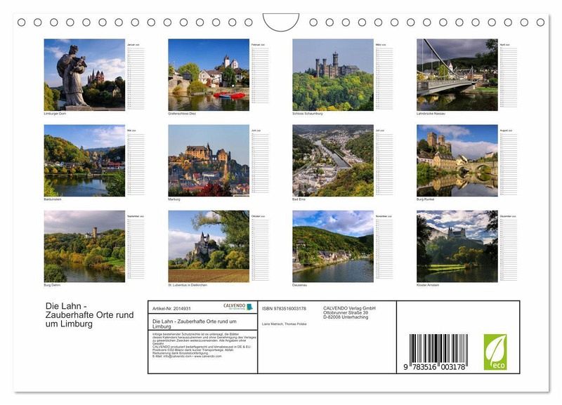 Egal ob Sie das Lahntal als Besucher, Wasserwanderer oder Radfahrer erleben - hinter jeder Flusswindung warten großartige Sehenswürdigkeiten oder versteckte Kleinode auf Ihre Entdeckung. Dieser Kalender zeigt in abwechslungsreichen Bildern die Vielfalt dieser Region in Hessen und Rheinland-Pfalz. Mit dabei sind u.a. das weltbekannte Limburg, Bad Ems und die Universitätsstadt Marburg.
