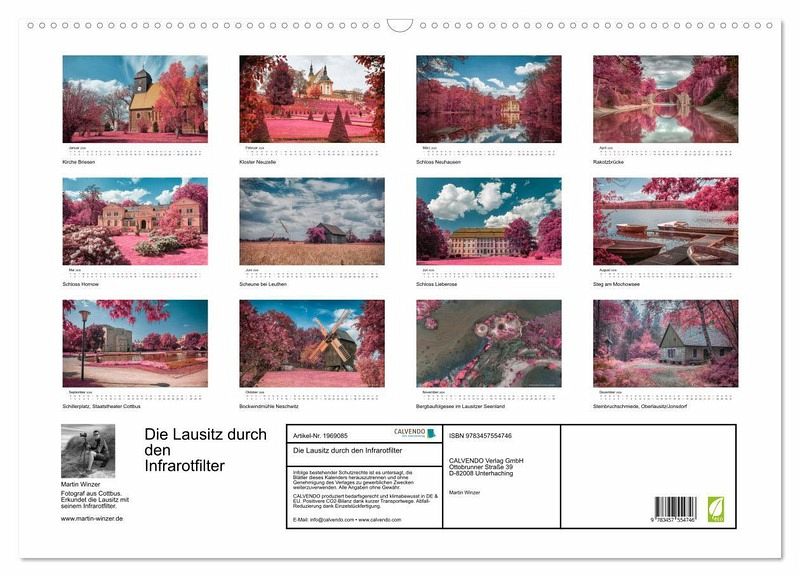 Dieser hochwertige Kalender präsentiert Ihnen sehenswerte Orte in der Lausitz im Stil des alten Analog-Film Kodak Aerochrome. Er wurde für den Einsatz bei der militärischen Luftaufklärung entwickelt und wird heute nicht mehr hergestellt. Entdecken Sie das Lausitzer Seenland, die Rakotzbrücke, das Kloster Neuzelle, historische Schlösser und klare Wasserspiegelungen aus der Ober- und Niederlausitz in digital erzeugten Infrarotaufnahmen.