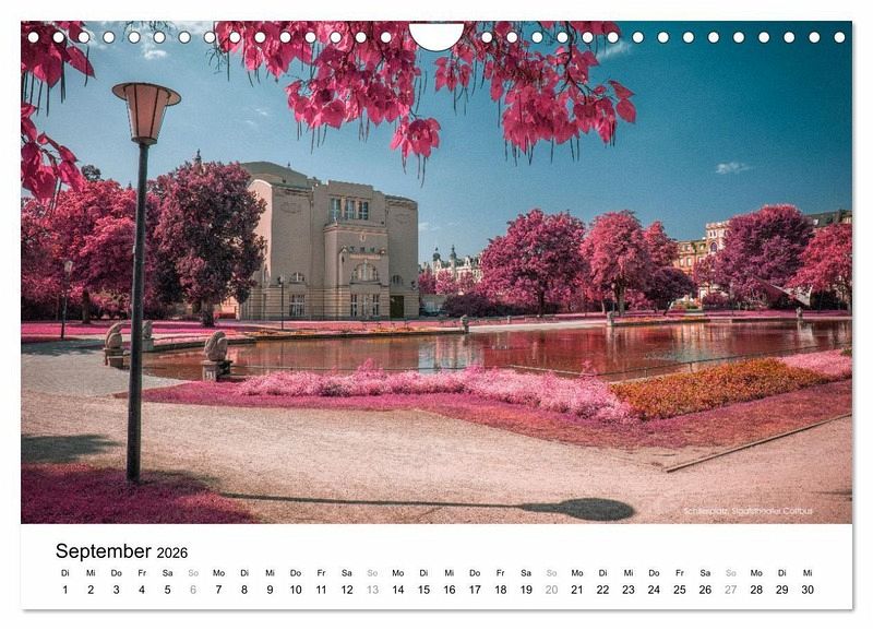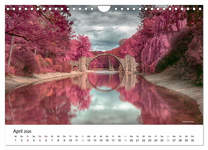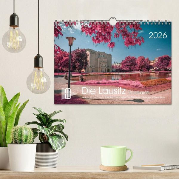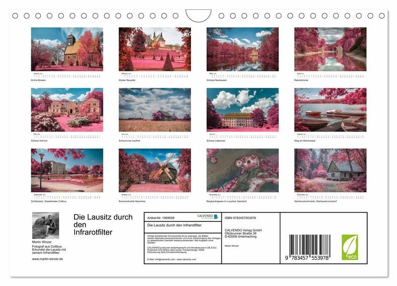 Dieser hochwertige Kalender präsentiert Ihnen sehenswerte Orte in der Lausitz im Stil des alten Analog-Film Kodak Aerochrome. Er wurde für den Einsatz bei der militärischen Luftaufklärung entwickelt und wird heute nicht mehr hergestellt. Entdecken Sie das Lausitzer Seenland, die Rakotzbrücke, das Kloster Neuzelle, historische Schlösser und klare Wasserspiegelungen aus der Ober- und Niederlausitz in digital erzeugten Infrarotaufnahmen.