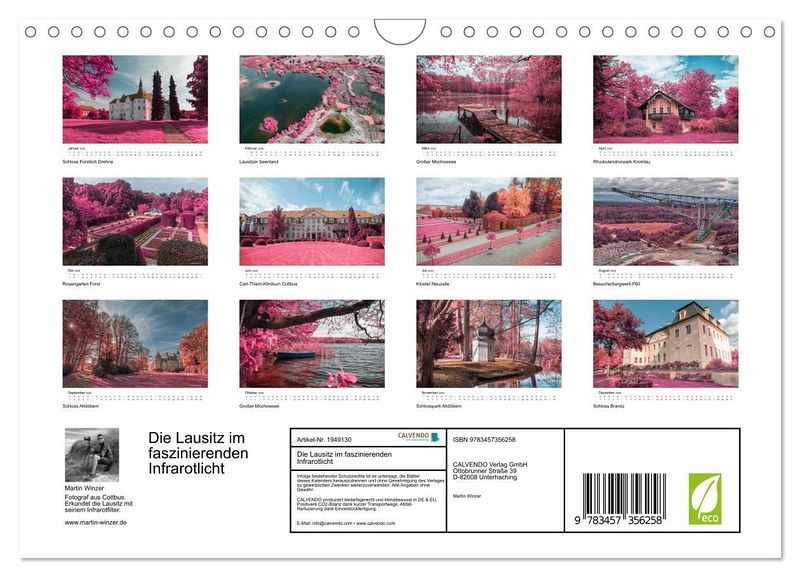Dieser hochwertige Kalender präsentiert Ihnen vielfältige Landschaften der Lausitz im Stil des alten Analog-Film Kodak Aerochrome. Infrarotfilter können verwendet werden, um bestimmte Wellenlängen des Lichts zu blockieren und nur Infrarotstrahlung durchzulassen. Entdecken Sie Parkanlagen, Schlösser und schöne Wanderrouten der einstigen Tagebaulandschaft in einer faszinierenden Farbgebung.