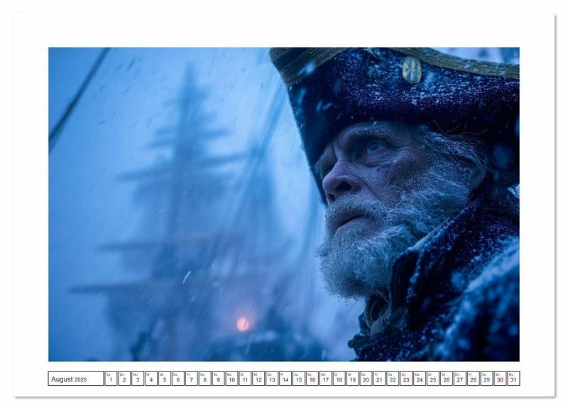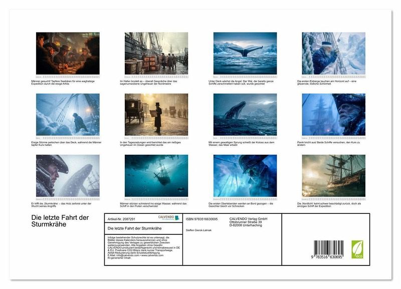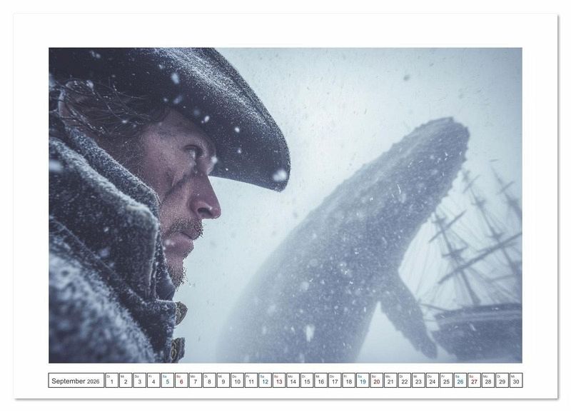 Ein Wal, so groß wie ein Albtraum, herrscht über die eisigen Gewässer - und er hat bereits viele Schiffe auf dem Gewissen. Als der Gigant aus den Tiefen emporsteigt, zählt nur eines: Überleben. Ein Schiff wird zerschmettert. Ein Kapitän geht mit seinem Schiff unter. Nur wenige kehren zurück, um die Geschichte zu erzählen. Eiskalte See. Brennende Panik. Der Kampf gegen das Ungeheuer beginnt. Alle hier gezeigten Bilder wurden mit Sorgfalt, Liebe und mit Hilfe einer KI generiert. Abschließend werden sie mit Bildbearbeitungsprogrammen überarbeitet und in den Kalender eingefügt.