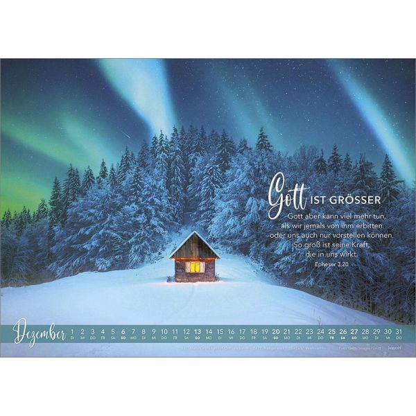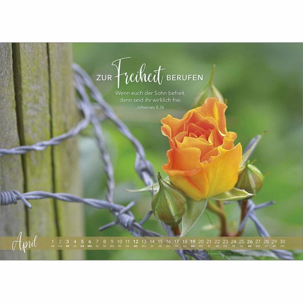 NEU: Bibel-Wort WandkalenderIn der Bibel finden wir unzählige Zusagen Gottes, die uns ermutigen, herausfordern, stärken und trösten können. Dieser inspirierende Wandkalender kombiniert prägnante Verheißungen Gottes mit brillanten Bildern.Er ist eine stilvolle Einladung, Gottes Liebe mit dem Herzen zu sehen und seine Zusagen vertrauensvoll und dankbar im Blick zu behalten.14 BlattKunstdruckSpiralbindung