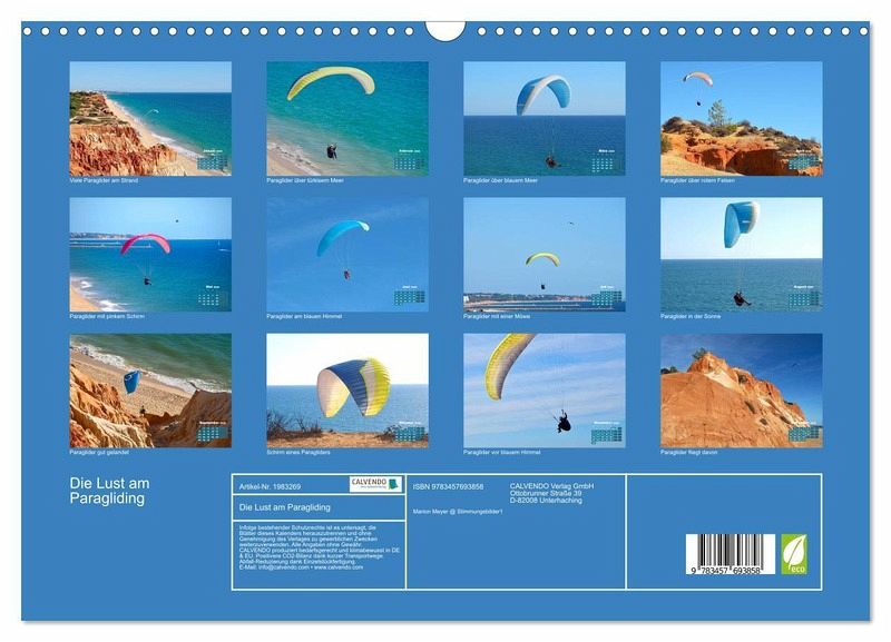 QUALITÄT - Hochwertiger Fotokalender mit 12 wunderschönen Motiven auf lichtbeständigem Bilderdruckpapier, robuste Spiralbindung mit Aufhängebügel.NACHHALTIG - deutliche Abfallreduzierung durch bedarfsgerechte Einzelstückfertigung, umweltfreundliches FSC-zertifiziertes Papier, Produktion in Deutschland, klimabewusste Logistik.PERFEKTES GESCHENK - Kalender für Freunde und Familie, für Kinder und Erwachsene, jung und alt, zu Weihnachten, Geburtstag oder zwischendurch.VIELFALT - Bildkalender in verschiedenen Formaten, z.B. DIN A5, DIN A4, DIN A3 sowie DIN A2. Ob Naturmotiv, Gemälde oder Fotos, ideal für ein persönliches Wohlfühlambiente.Dei Freiheit genießt man beim Paragliding von Autor(in): Stimmungsbilder1