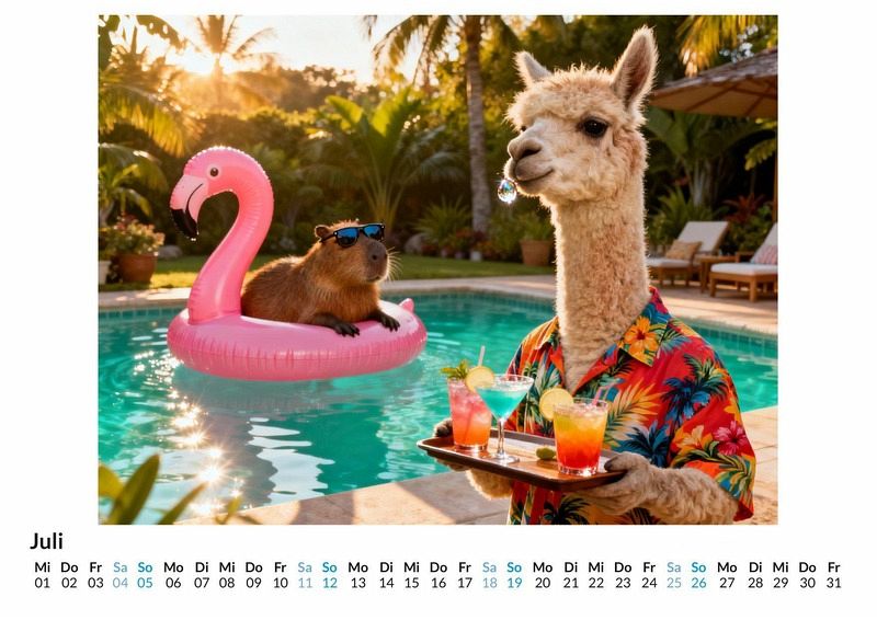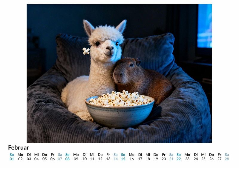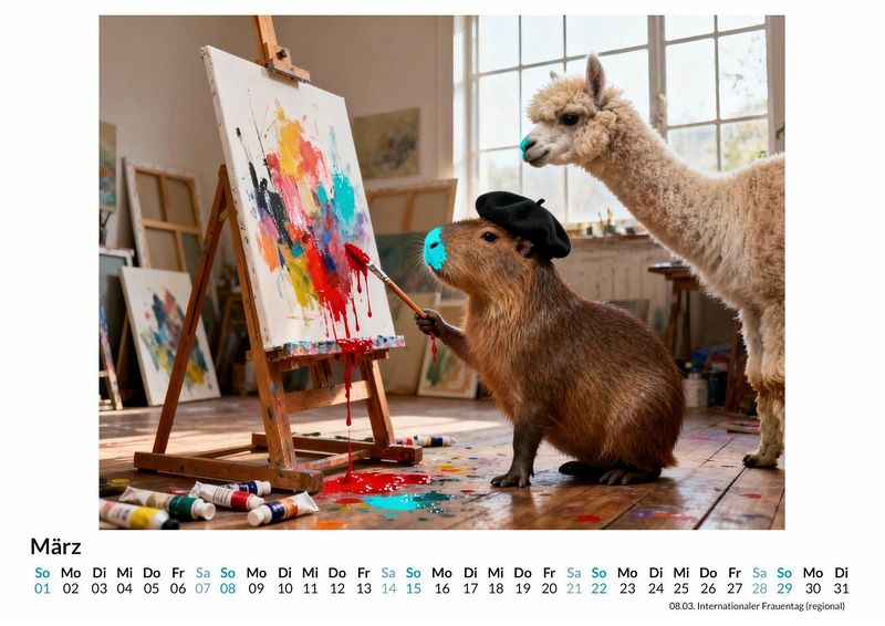 Was passiert, wenn die entspanntesten Tiere der Welt beschließen, den menschlichen Alltag zu erobern? Der Kalender "Die lustige Welt der Alpakas & Capybaras" gibt die Antwort in zwölf amüsanten Szenarien, die den Charme dieser beiden Spezies auf eine ganz neue Ebene heben. Dieser Kalender ist eine ausgezeichnete Wahl: * Für alle, die von Alpakas und Wasserschweinen nicht genug bekommen können. * Für Menschen mit einem Sinn für skurrilen Humor und originelle Bildideen. * Für Suchende nach einem besonderen Geschenk, das garantiert für ein Lächeln sorgt. Monat für Monat entfalten sich Szenen, die man so noch nicht gesehen hat. Ein Alpaka als Barista, das einen komplizierten Latte Art kreiert, oder ein Capybara, das tiefenentspannt im Wellnessbad sitzt. Diese Bilder sind weder gemalt noch klassisch fotografiert. Sie entspringen einer kreativen Synthese aus digitaler Vorstellungskraft und komplexen Algorithmen, die diese einzigartigen Momente zum Leben erwecken. Jedes Motiv erzählt eine kleine Geschichte und bringt eine Prise Leichtigkeit in den Alltag. Mit dem Kauf dieses Kalenders kann man Folgendes erwarten: * Zwölf humorvolle Monatsmotive mit den beliebten Trend-Tieren. * Ein praktisches Kalendarium für die Organisation des Jahres. * Eine monatliche Dosis Heiterkeit für die Wand zu Hause oder im Büro. Der Kalender "Die lustige Welt der Alpakas & Capybaras" ist eine Hommage an die komischen Seiten des Lebens, interpretiert von seinen flauschigsten und gelassensten Hauptdarstellern. Ein Blick auf die Monatsansichten lohnt sich, um die volle Vielfalt der inszenierten Szenen zu entdecken.