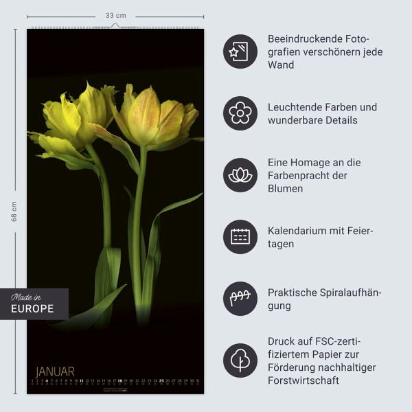 - Stilvoller Blütenzauber in XL: Wandkalender mit farbenprächtiger Fotokunst- Monat für Monat leuchtend-schöne Blumen, die jeden Wohnraum erhellen- Die perfekte Symbiose von digitaler Fotokunst und bunten Natur-Motiven: Jahres-Wandkalender mit Bildern der bekannten britischen Fotografin Magda Indigo- Die ganze Vielfalt heimischer und exotischer Flora bewundern: Monatskalender im Blickfang-Format 33 x 68 cm- Die volle Schönheit der Natur in atemberaubenden Aufnahmen: Bildkalender von Weingarten im Athesia Kalenderverlag