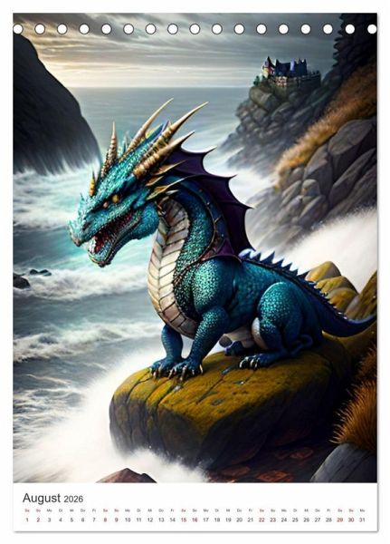 August: Drache auf einem Felsvorsprung mit Burg im Hintergrund
