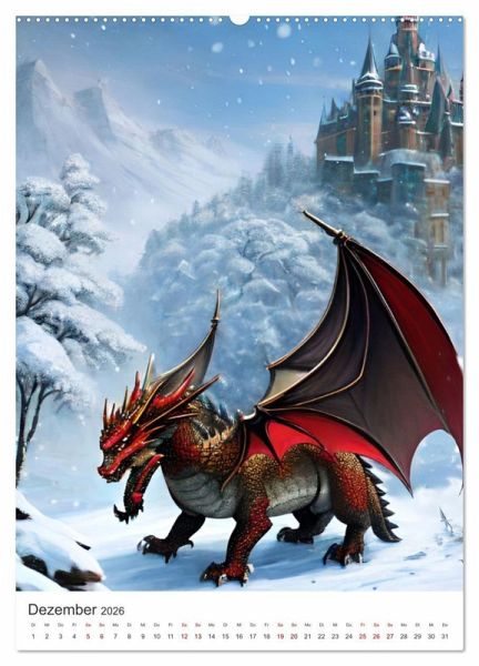Dezember: Drache im Schnee mit Burg im Hintergrund