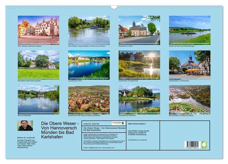 Tauche ein in die malerische Schönheit der Weser mit einem einzigartigen Fotokalender! Von Hann. Münden, wo Werra und Fulda sich zur Weser vereinen, bis nach Bad Karlshafen, wo sich Geschichte und Natur eindrucksvoll verbinden - dieser Kalender fängt die faszinierenden Landschaften, romantischen Fachwerkhäuser und majestätischen Flussblicke entlang der Weser ein. Stimmungsvolle Sonnenaufgänge, Nebelschleier über dem Wasser und die idyllischen Ufer lassen jeden Monat aufs Neue die Magie dieser Region aufleben. Perfekt für Naturliebhaber, Heimatverbundene und alle, die die Weser immer im Blick haben möchten!