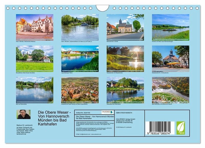 Tauche ein in die malerische Schönheit der Weser mit einem einzigartigen Fotokalender! Von Hann. Münden, wo Werra und Fulda sich zur Weser vereinen, bis nach Bad Karlshafen, wo sich Geschichte und Natur eindrucksvoll verbinden - dieser Kalender fängt die faszinierenden Landschaften, romantischen Fachwerkhäuser und majestätischen Flussblicke entlang der Weser ein. Stimmungsvolle Sonnenaufgänge, Nebelschleier über dem Wasser und die idyllischen Ufer lassen jeden Monat aufs Neue die Magie dieser Region aufleben. Perfekt für Naturliebhaber, Heimatverbundene und alle, die die Weser immer im Blick haben möchten!