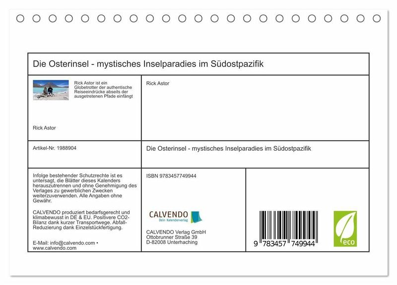 QUALITÄT - Hochwertiger Fotokalender mit 12 wunderschönen Motiven auf lichtbeständigem Bilderdruckpapier, robuste Spiralbindung.NACHHALTIG - deutliche Abfallreduzierung durch bedarfsgerechte Einzelstückfertigung, umweltfreundliches FSC-zertifiziertes Papier, Produktion in Deutschland, klimabewusste Logistik.PERFEKTES GESCHENK - Kalender für Freunde und Familie, für Kinder und Erwachsene, jung und alt, zu Weihnachten, Geburtstag oder zwischendurch.VIELFALT - Bildkalender in verschiedenen Formaten, z.B. DIN A5, DIN A4, DIN A3 sowie DIN A2. Ob Naturmotiv, Gemälde oder Fotos, ideal für ein persönliches Wohlfühlambiente.Die isolierteste Insel der Welt besticht nicht nur durch ihre geheimnisvollen Moai Steinskulpturen, sondern auch durch eine einzigartige Landschaft. von Autor(in): Rick Astor