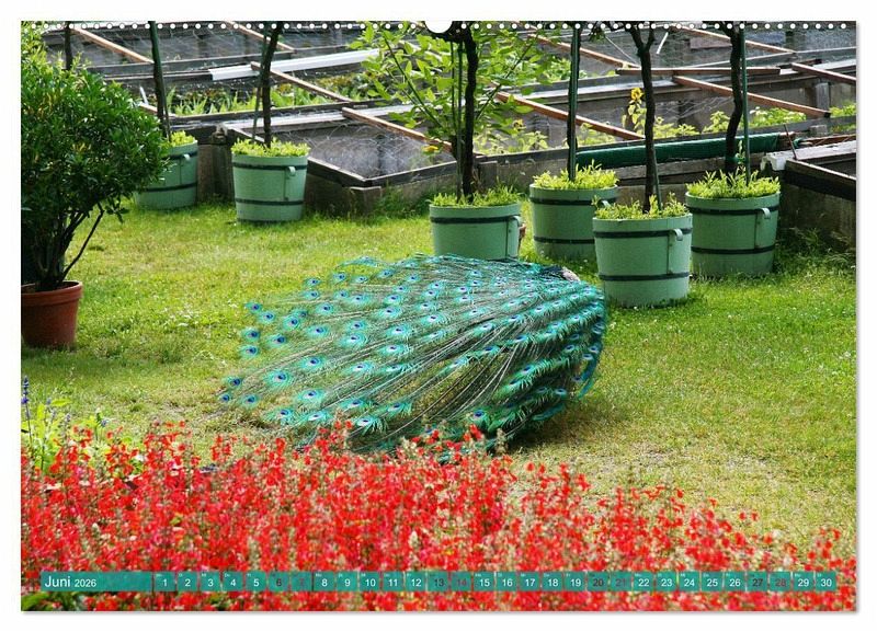 Der 67 Hektar große Landschaftspark steht seit 1990 auf der Welterbeliste und ist ein Naturschutzgebiet. Unter König Friedrich Wilhelm II., dem Nachfolger von Friedrich dem Großen, wurden das Schloss und die Meierei errichtet. Der König siedelte auch die Pfaue auf der Insel an, die bis heute dort leben. Wunderschöne Rad schlagende Blaue Pfaue schmücken diesen zauberhaften Kalender.