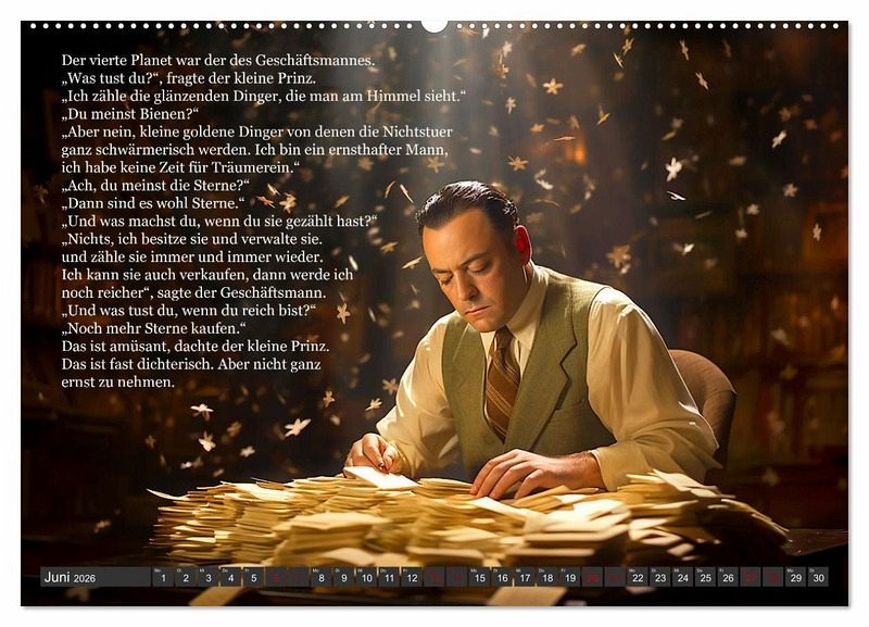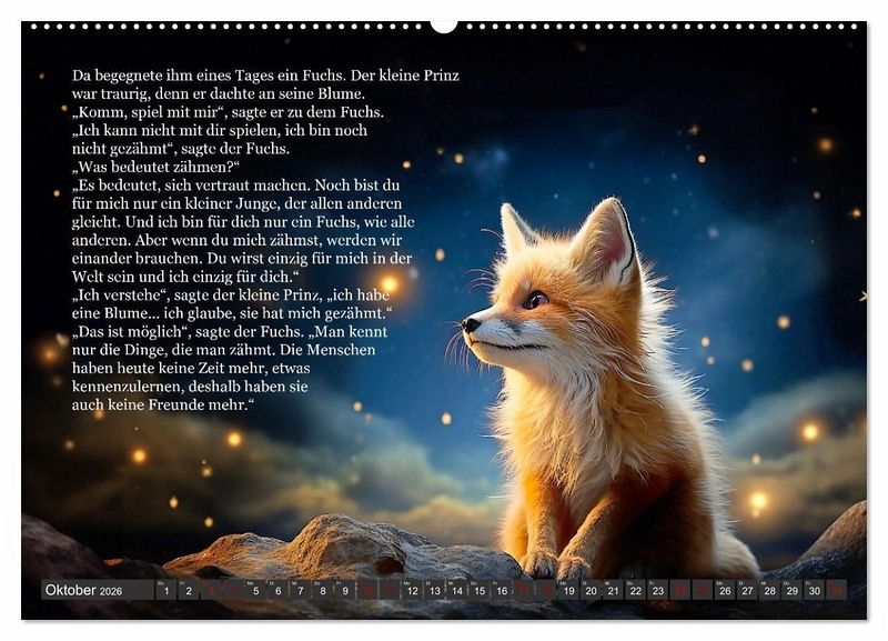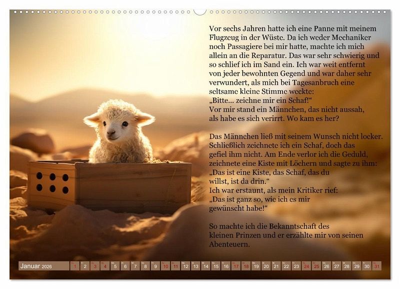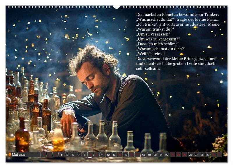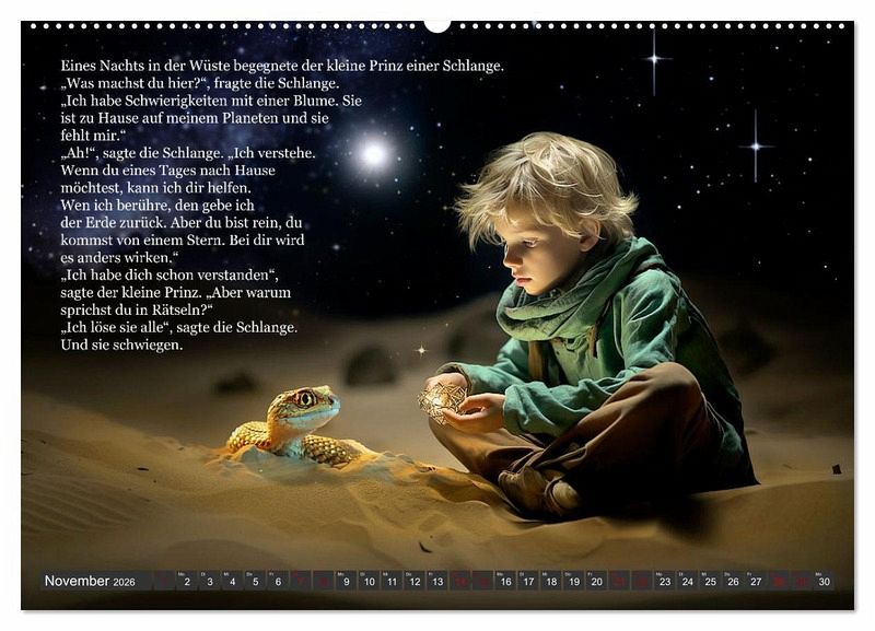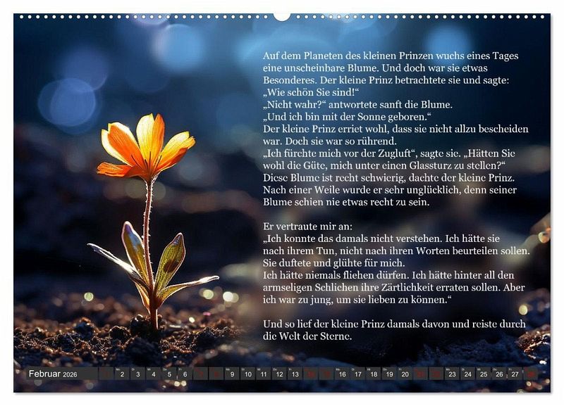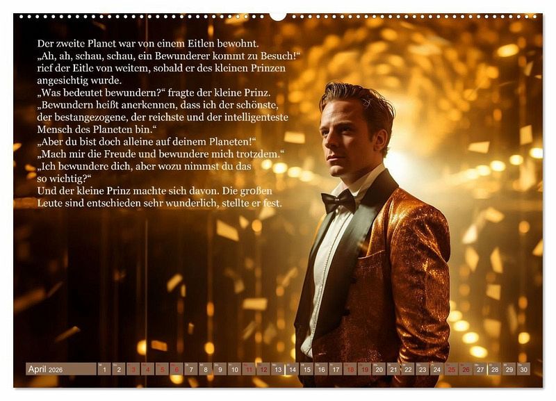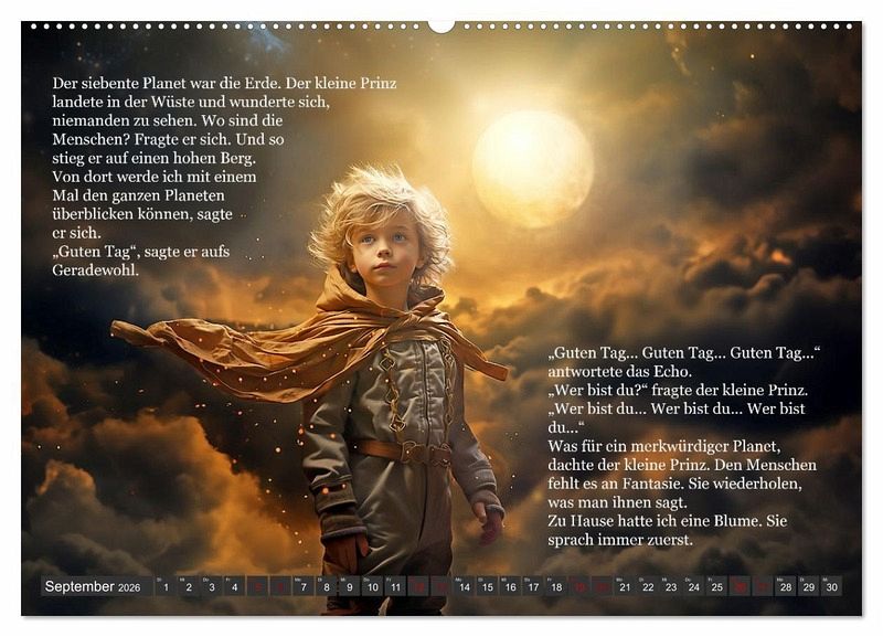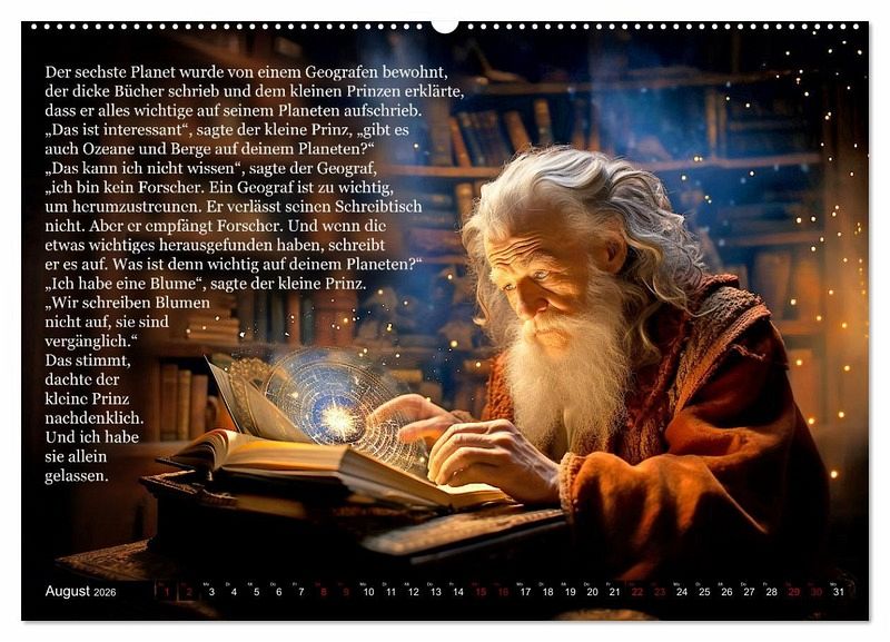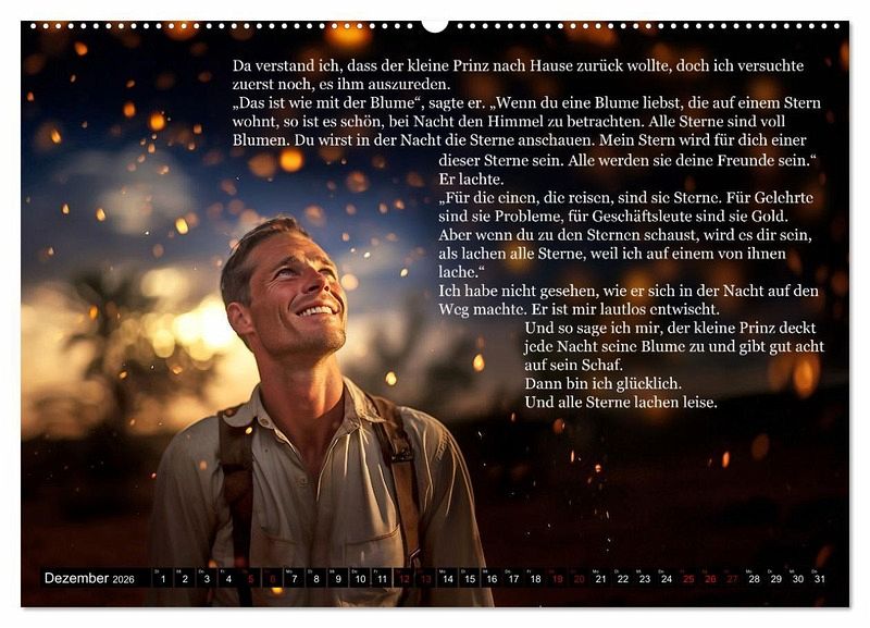 Die zeitlose Weisheit des kleinen Prinzen, die Geschichten über Liebe, Freundschaft und Verantwortung werden niemals alt. Mit diesem Kalender möchte ich dazu inspirieren, das Buch doch mal wieder zur Hand zu nehmen. Das letzte Bild ist gestaltet im Gedenken an Antoine de Saint-Exupéry, ungefähr in dem Alter, in dem der Autor war, als er das Buch schrieb. Möge er heute dort oben sein und den kleinen Prinzen besuchen. Die Bilder wurden gestaltet mit KI und Photoshop. Die Texte sind Mischungen aus Zusammenfassungen und Zitaten.