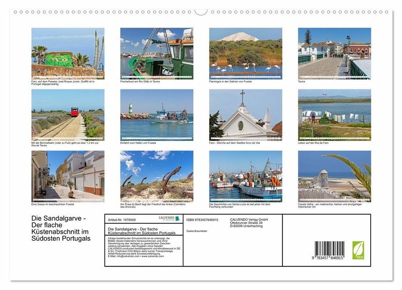 PREMIUM-LINIE - Brillanter Fotokalender mit 12 wunderschönen Motiven, Kunstdruck in Hochglanz in Museumsqualität.QUALITÄT - edle Materialien, stabile Rückwand mit 2 innovativen Einstecktaschen für eine optimale Präsentation an der Wand.NACHHALTIG - deutliche Abfallreduzierung durch bedarfsgerechte Einzelstückfertigung, umweltfreundliches FSC-zertifiziertes Papier, Produktion in Deutschland, klimabewusste Logistik.PERFEKTES GESCHENK - Kalender für Freunde und Familie, für Kinder und Erwachsene, jung und alt, zu Weihnachten, Geburtstag oder zwischendurch.Die Sandalgarve (Sotavento) ist ein flacher Küstenabschnitt im Süden Portugals, der sich zwischen der Hafenstadt Faro und der spanischen Grenze von Autor(in): Gisela Braunleder