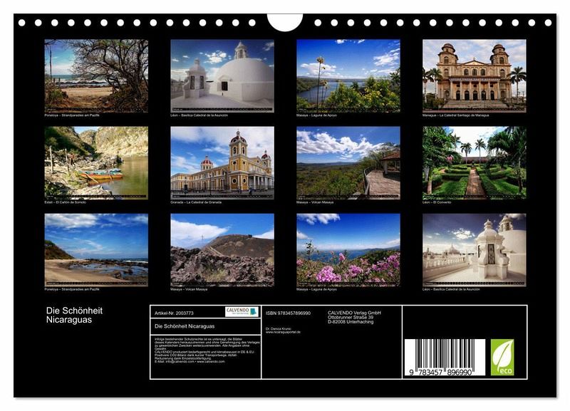 Traumschönes Wetter, herrliche weiße Sandstrände mit sauberem Wasser, alte Kolonialstädte und unberührte Urwälder ... Nicaragua wird Sie begeistern! Nicaraguas einzigartige geographische Lage zwischen Honduras und Costa Rica, zwischen Atlantik und Pazifik verzaubert Sie mit seiner außergewöhnlich schönen Naturvielfalt aus Vulkanen, Regenwäldern und Seen sowie seiner zauberhaft romantischen Kolonialarchitektur. Dieser hochqualitative Fotokalender ist ein Muss für jeden Nicaragua-Liebhaber.