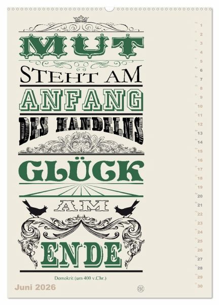 Abbildungen: Januar: Gib jedem Tag die Chance, der schönste deines Lebens zu werden. Februar: Das Gestern ist fort, das Morgen nicht da. Lebe also heute. März: Heiterkeit ist der Ursprung aller glücklichen Einfälle. April: Das Leben ist bezaubernd. Man muss es nur durch die richtige Brille sehen. Mai: Wer den Himmel nicht in sich selber trägt, sucht ihn vergebens...…mehr