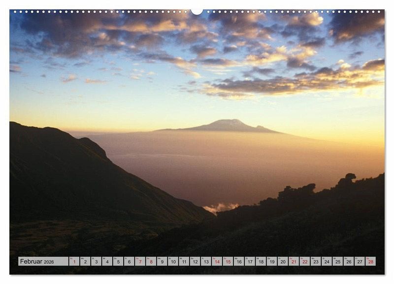 Februar: Kilimanjaro (5895 m) im Sonnenaufgang. Gesehen vom Nachbarvulkan Mt. Meru, Tansania