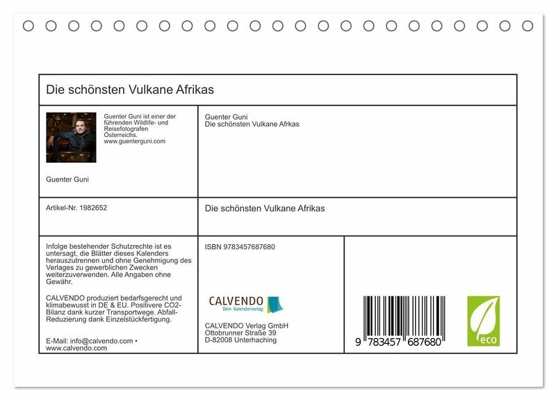 QUALITÄT - Hochwertiger Fotokalender mit 12 wunderschönen Motiven auf lichtbeständigem Bilderdruckpapier, robuste Spiralbindung.NACHHALTIG - deutliche Abfallreduzierung durch bedarfsgerechte Einzelstückfertigung, umweltfreundliches FSC-zertifiziertes Papier, Produktion in Deutschland, klimabewusste Logistik.PERFEKTES GESCHENK - Kalender für Freunde und Familie, für Kinder und Erwachsene, jung und alt, zu Weihnachten, Geburtstag oder zwischendurch.VIELFALT - Bildkalender in verschiedenen Formaten, z.B. DIN A5, DIN A4, DIN A3 sowie DIN A2. Ob Naturmotiv, Gemälde oder Fotos, ideal für ein persönliches Wohlfühlambiente.Afrikas berühmte Vulkane Kilimanjaro und Mt. Kenya - und dazu weitere beeindruckende, oft unbekannte Vulkane in Tansania, Kenia, Äthiopien, Kongo, Ruanda und Uganda. von Autor(in): Guenter Guni
