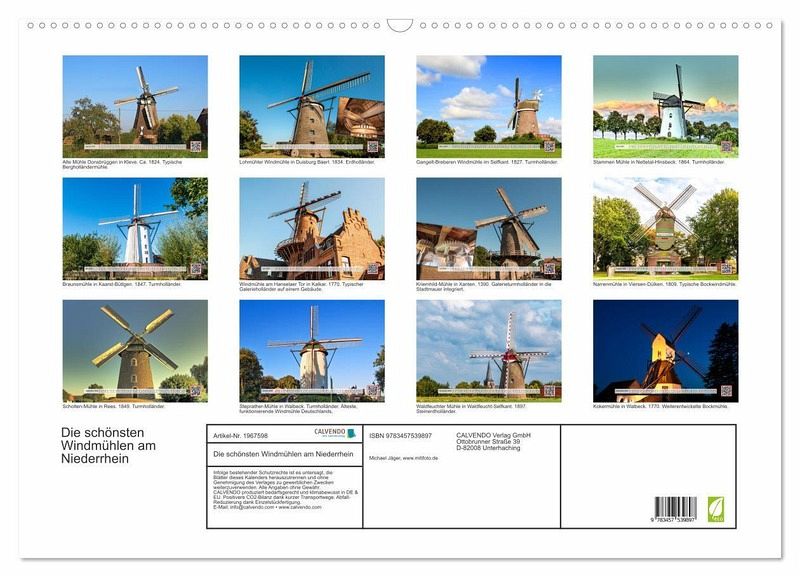 Windmühlen werden seit Tausenden Jahren von Menschen genutzt, um Antriebsenergie zu gewinnen. Viele historische Mühlen sind inzwischen stillgelegt oder abgerissen. Aber einige Windmühlen wurden als Technikdenkmäler erhalten. Eine funktionierende Windmühle von innen zu betrachten ist ein beeindruckendes Schauspiel. Der Müller war mehr ein Zimmermann und Meister der Mechanik. Er musste seine Mühle perfekt kennen, um ein optimales Produkt zu erhalten. Dieser Mühlenkalender richtet sich an Mühlenfreunde und jene, die sich für den Erhalt dieser Kulturgüter einsetzen. Weitere Details zu den dargestellten Mühlen sind mit dem jeweilien QR-Code abrufbar.