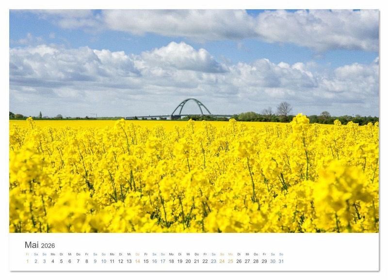 Mai: Rapsfeld mit Fehmarnsundbrücke