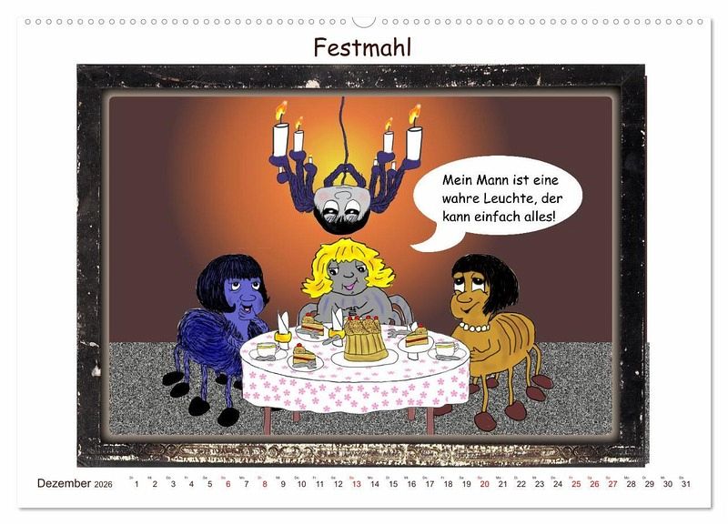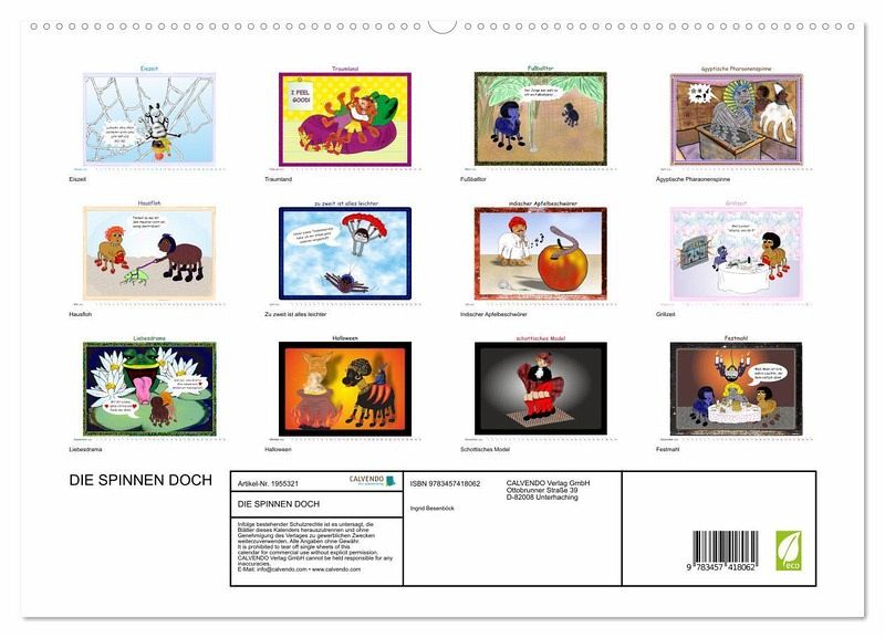 Ein Jahreskalender mit witzigen Spinnereien über achtbeinige Krabbler. Auch wenn man Spinnen nicht mag, so wird man an diesen knubbeligen Comic Spinnchen einfach Gefallen finden, denn sie zeigen sich von einer durchaus menschlichen und amüsanten Seite.