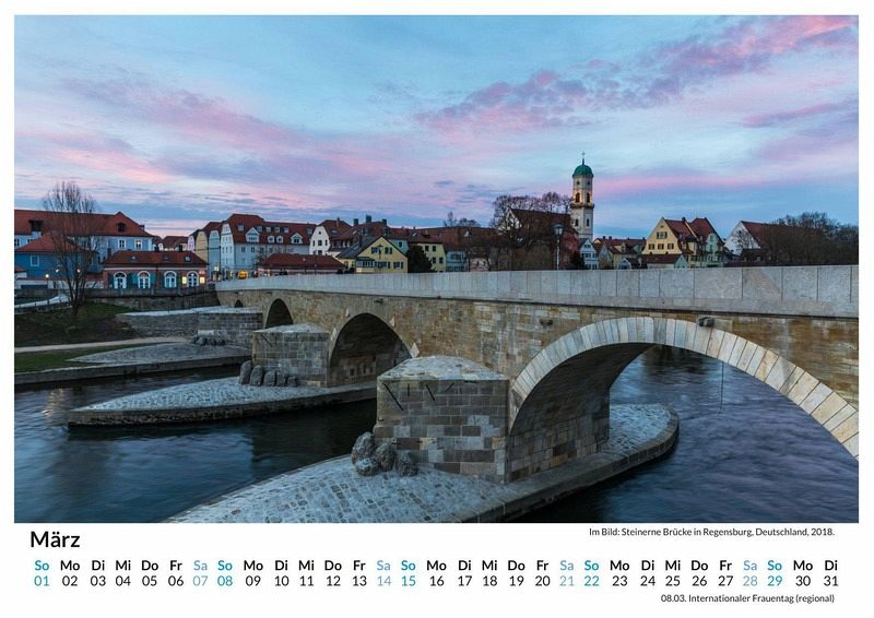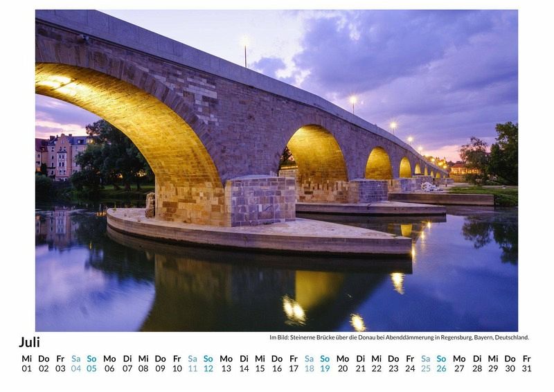 Entdecken Sie die faszinierende Geschichte und Schönheit der Steinernen Brücke in Regensburg mit unserem exklusiven Wandkalender! Dieser hochwertige Kalender präsentiert 12 atemberaubende Motive der über 850 Jahre alten Brücke, die als Meisterwerk mittelalterlicher Baukunst gilt. Gedruckt auf lichtbeständigem, FSC-zertifiziertem Bilderdruckpapier, bringt er die Magie dieses UNESCO-Weltkulturerbes direkt in Ihr Zuhause. Perfekt für Liebhaber historischer Architektur und Regensburg-Fans! Jeder Monat wird Sie mit einem neuen, liebevoll ausgewählten Bild begeistern. Holen Sie sich ein Stück Geschichte an Ihre Wand - ideal auch als Geschenk! Hochwertig Erleben Sie ein Jahr voller Eleganz mit unserem Premium-Fotokalender. Jedes der 12 Motive ist auf hochwertigem, lichtbeständigem Bilderdruckpapier gedruckt, um die Lebendigkeit jedes Bildes zu bewahren. Die robuste Spiralbindung gewährleistet Langlebigkeit und einfache Handhabung. Nachhaltig Unser Engagement für die Umwelt spiegelt sich in jedem Exemplar wider. Durch die Produktion auf Abruf reduzieren wir signifikant unseren Abfall. Wir verwenden ausschließlich umweltfreundliches, FSC-zertifiziertes Papier. Stolz gefertigt in Deutschland, achten wir bei unserer Logistik auf Klimaschutz, um unseren ökologischen Fußabdruck zu minimieren. Das ideale Geschenk Dieser Kalender ist das perfekte Präsent für jeden Anlass - ob Weihnachten, Geburtstage oder einfach als liebevolle Aufmerksamkeit zwischendurch. Geeignet für Freunde, Familie, Kinder und Erwachsene gleichermaßen, bereichert er jedes Zuhause mit seiner Vielfalt und Schönheit, unabhängig vom Alter der Beschenkten.