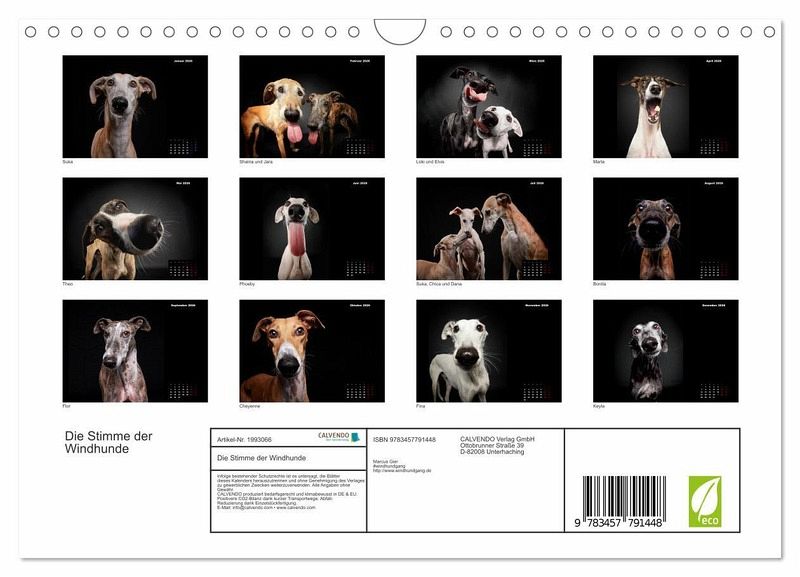 Die Stimme der spanischen Windhunde in Bildern. Jedes Jahr werden nach der Jagdsaison tausende von Windhunden entsorgt, weil sie nicht mehr zur Jagd taugen oder einfach nur zu langsam sind. Dieser Kalender zeigt die wundervollen Tiere aus einer ganz anderen Perspektive und ist ein Dank an Alle, die sich für diese Hunde einsetzen.