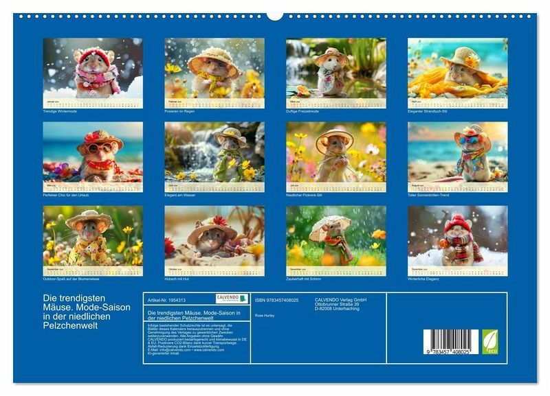 Erfreue dich an der aufregenden Welt der Mäuse-Fashion. Mit diesem lieblichen Kalender, der mit Hilfe von KI erstellt wurde, hat man das ganze Jahr über Vergnügen! Die pelzigen Models haben die unterschiedlichsten Orte erobert - sei es am sonnigen Strand, am Wasser, im Schnee, oder in der grünen Natur. Lass dich von ihrem bunten Stil inspirieren, denn die Mäuse wissen einfach, wie man sich gut kleidet und dabei jede Menge Spaß hat! Mach dein Jahr zu einem modischen Fest und erfreue dich an den charmantesten Nagetieren der Welt!"
