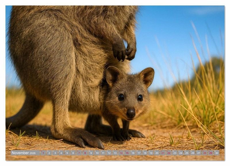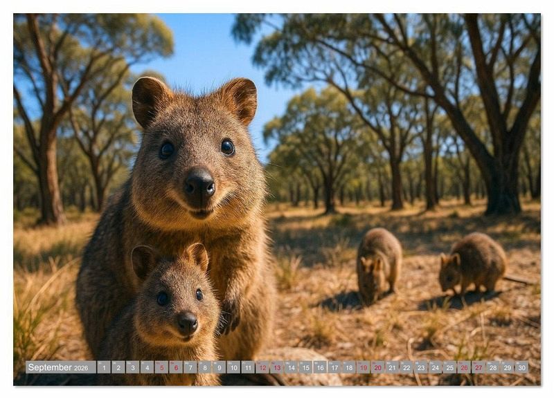 Erleben Sie Australiens Outback aus einer neuen Perspektive - mit Quokkas, die neugierig, frech und absolut echt wirken. Jeder Monat zeigt fotorealistische Szenen, geschaffen mit modernster KI-Technologie, die natürliche Details und Landschaften originalgetreu einfängt. Ein Kalender für alle, die Wildtiere lieben und sehen wollen, wie Künstliche Intelligenz Kunst und Natur vereint. Lassen Sie sich ein Jahr lang vom Charme dieser besonderen Outback-Bewohner begleiten.