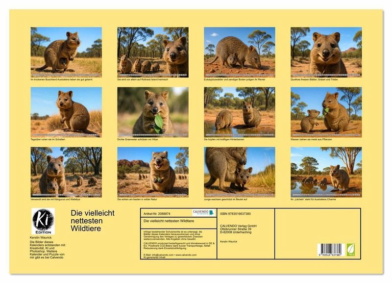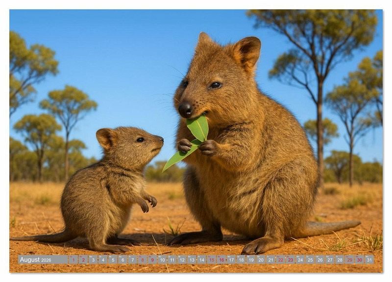 Erleben Sie Australiens Outback aus einer neuen Perspektive - mit Quokkas, die neugierig, frech und absolut echt wirken. Jeder Monat zeigt fotorealistische Szenen, geschaffen mit modernster KI-Technologie, die natürliche Details und Landschaften originalgetreu einfängt. Ein Kalender für alle, die Wildtiere lieben und sehen wollen, wie Künstliche Intelligenz Kunst und Natur vereint. Lassen Sie sich ein Jahr lang vom Charme dieser besonderen Outback-Bewohner begleiten.