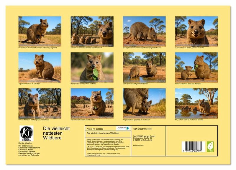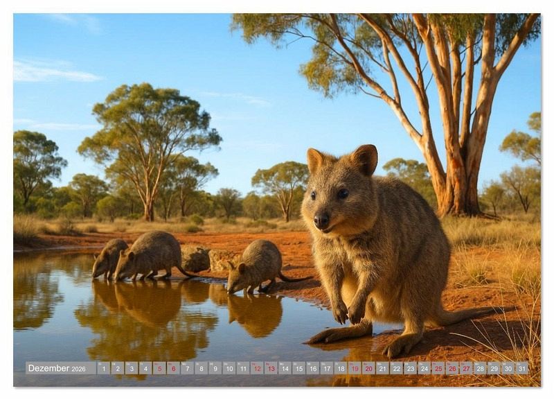 Erleben Sie Australiens Outback aus einer neuen Perspektive - mit Quokkas, die neugierig, frech und absolut echt wirken. Jeder Monat zeigt fotorealistische Szenen, geschaffen mit modernster KI-Technologie, die natürliche Details und Landschaften originalgetreu einfängt. Ein Kalender für alle, die Wildtiere lieben und sehen wollen, wie Künstliche Intelligenz Kunst und Natur vereint. Lassen Sie sich ein Jahr lang vom Charme dieser besonderen Outback-Bewohner begleiten.