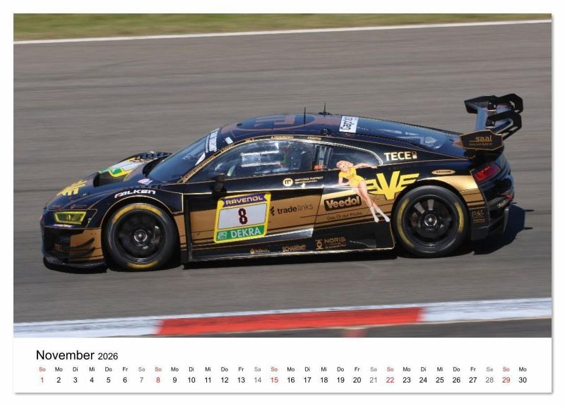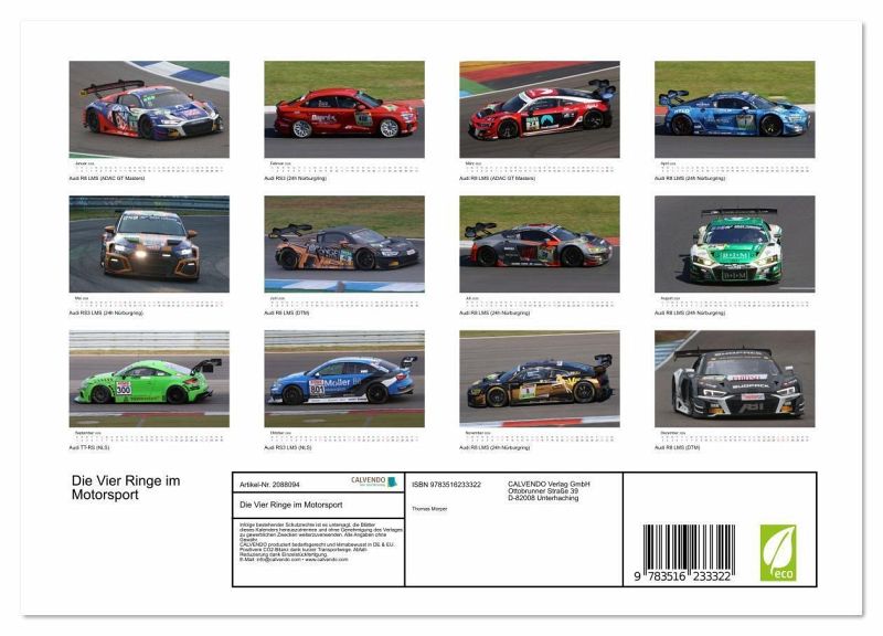 Audi bietet mit seinen Werksteams und vielen privaten Teams eine breite Palette an Motorsport Aktivitäten. Dieser Kalender bietet einen Querschnitt über einige dieser Fahrzeuge. Er enthält Bilder diverser Audi Rennfahrzeuge vom 24h Rennen auf dem Nürburgring, aus der NLS, dem ADAC GT Masters sowie der DTM.