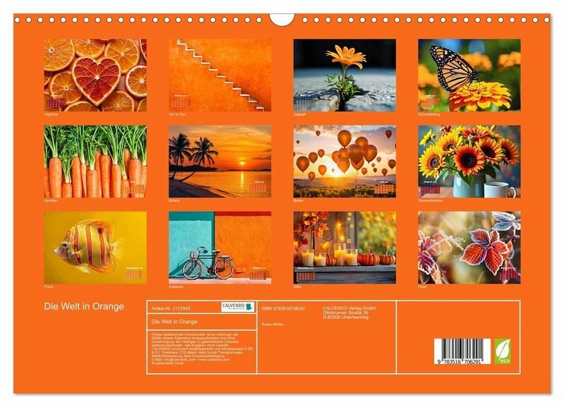 Die Welt in Orange, ist mehr als nur ein Kalender , er ist eine Einladung, das Leben mit warmen Augen zu sehen. Jeder Monat bringt dir neue Motive voller Licht, Kraft und Lebendigkeit. Orange , die Farbe des Aufbruchs, der Sonne und der Energie ,begleitet dich durch das ganze Jahr. Lass dich verzaubern von einer Welt, die Wärme ausstrahlt, Hoffnung schenkt und Inspiration in den Alltag bringt.