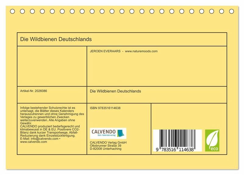 QUALITÄT - Hochwertiger Fotokalender mit 12 wunderschönen Motiven auf lichtbeständigem Bilderdruckpapier, robuste Spiralbindung.NACHHALTIG - deutliche Abfallreduzierung durch bedarfsgerechte Einzelstückfertigung, umweltfreundliches FSC-zertifiziertes Papier, Produktion in Deutschland, klimabewusste Logistik.PERFEKTES GESCHENK - Kalender für Freunde und Familie, für Kinder und Erwachsene, jung und alt, zu Weihnachten, Geburtstag oder zwischendurch.VIELFALT - Bildkalender in verschiedenen Formaten, z.B. DIN A5, DIN A4, DIN A3 sowie DIN A2. Ob Naturmotiv, Gemälde oder Fotos, ideal für ein persönliches Wohlfühlambiente.Fotografische Einblicke in das Leben von 12 verschiedenen einheimischen Wildbienen von Autor(in): Jeroen Everaars