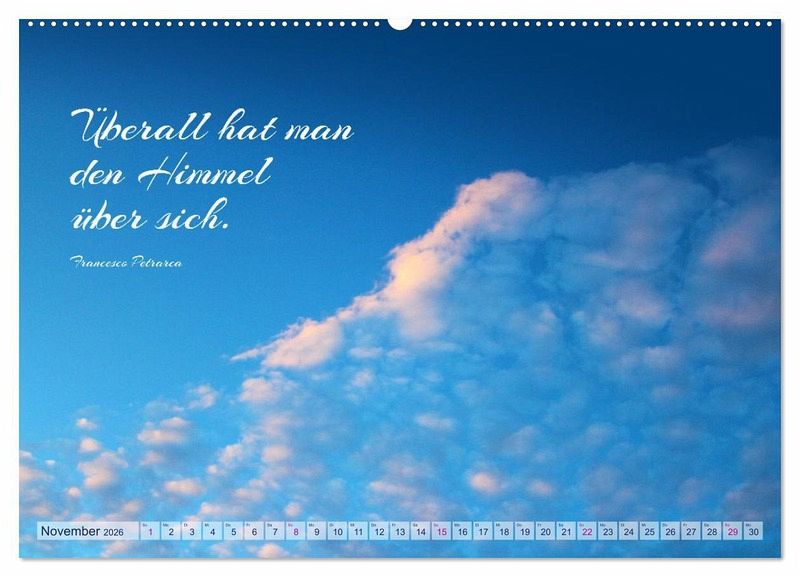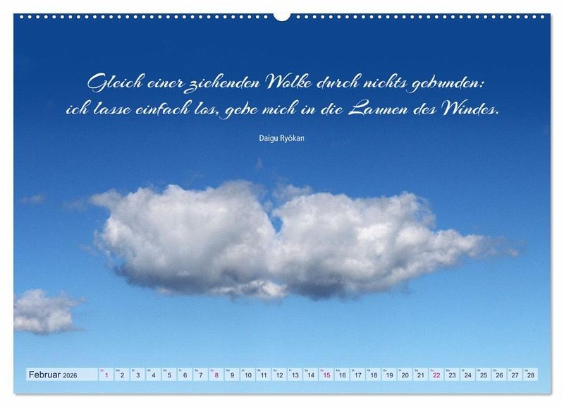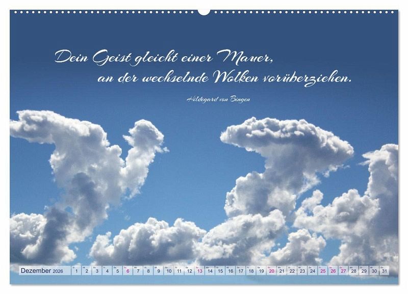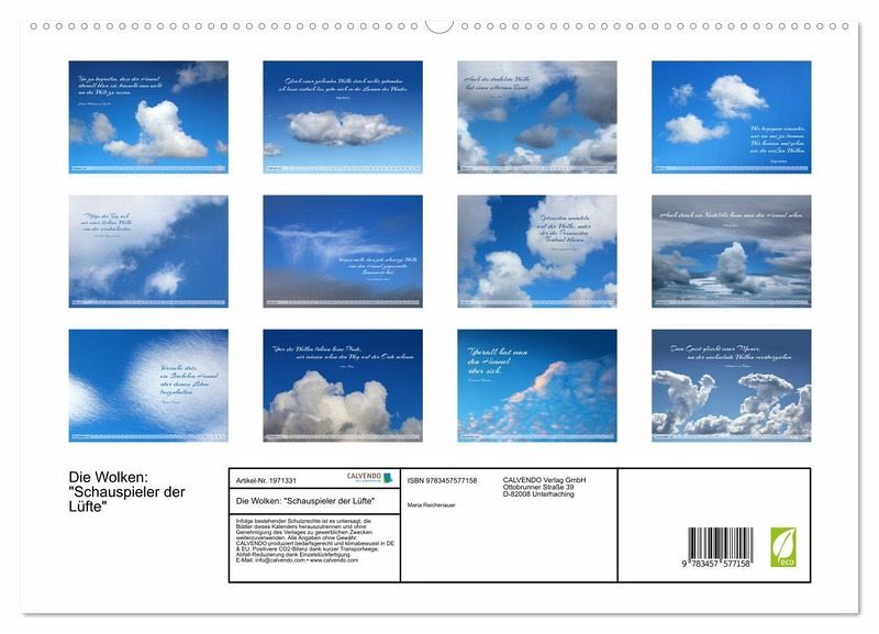 PREMIUM-LINIE - Brillanter Fotokalender mit 12 wunderschönen Motiven, Kunstdruck in Hochglanz in Museumsqualität.QUALITÄT - edle Materialien, stabile Rückwand mit 2 innovativen Einstecktaschen für eine optimale Präsentation an der Wand.NACHHALTIG - deutliche Abfallreduzierung durch bedarfsgerechte Einzelstückfertigung, umweltfreundliches FSC-zertifiziertes Papier, Produktion in Deutschland, klimabewusste Logistik.PERFEKTES GESCHENK - Kalender für Freunde und Familie, für Kinder und Erwachsene, jung und alt, zu Weihnachten, Geburtstag oder zwischendurch.Ist es nicht ein schöner Zeitvertreib die Wolken am Himmel ziehen zu sehen? Lassen Sie sich treiben mit den fluffigen Wolkenbergen und den Worten von Dichtern und Philosophen. von Autor(in): Maria Reichenauer Maria