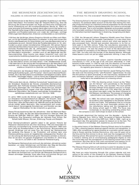 THE MEISSEN DRAWING SCHOOL - PAINTING TO ITS HIGHEST PERFECTION - Since 1764.The Drawing School is the start of a targeted training in the Meissen manufactory. Its existence takes account of the fact that training the interplay of eye and hand is an important practical preparation for the arts and crafts professions. Talent is a good prerequisite, but it alone is not enough to reach the goal. That is why porcelain designers and porcelain painters who have been working in the profession for a long time help apprentices to internalise important experiences in observing, recognising and depicting.In 1720, the 24-year-old Johann Gregorius Höroldt came from Vienna to Meissen to work for the porcelain manufactory. In a very short time he found many recipes for ceramic colours and, what was special, he also processed them. Höroldt lead porcelain decoration to its first artistic peak in the 18th century. Today, the manufactory associates his name not only with the memory of the most creative porcelain painter of the 18th century - he was the creator of most of the decorations that were created for porcelains of the Meissen manufactory between 1720 and 1764 - but also with the founder of the drawing lessons. Although these lessons could not yet be called systematic training, it was a first step. An improvement occurred when Johann Joachim Kaendler joined the manufactory in 1731, at the age of 25, and soon afterwards, in 1734, became model master. In 1740 he took over the direction of mould design in the manufactory and devoted himself to training in this context. He regularly gave lessons in drawing and modelling. In 1743, the painter and architect Carl Heinrich Jacob Fehling from Dresden took over the training of the "Lehr-Purschen" (apprentices). He was the first person to teach exclusively in the manufactory. Assistants helped, successors followed - and so the commitment of individuals eventually led to the establishment of a drawing school. In 1764, the drawing school, known as the "Meissen Art School" and subordinate to the Dresden Academy of Arts, was founded. The court painter Christian Wilhelm Ernst Dietrich was put in charge. He held this office until 1770. After that, the drawing school was again under the direct influence of the Meissen manufactory. The process of changing subordination was repeated from 1814 to 1836. In 1893, the school was even dissolved and gifted students were delegated to the Dresden School of Arts and Crafts. The realisation that an in-house training was the most favourable solution led to the manufactory taking over the management of the draing school again in 1906. The focus was increasingly on recruiting outstanding artists from the company's own work-shops to teach at the school.This principle determined the training over the decades - during the Weimar Republic from 1918 to 1933, the period of National Socialism from 1933 to 1945, the era of the GDR from 1945 to 1990 - right up to the present day. One generation passes its treasure on to the next. The treasure is knowledge, skill, experience, joy and discipline. In the entire history of the Meissen Drawing School since its foundation in 1764, a drawing teacher deserves special mention and recognition. In 1983, after completing her apprenticeship as a porcelain painter specialising in flower painting, Kordula Hieronymus, who was 23 years old at the time and the first woman to do so, took over the management of the drawing school. She earned her spurs in production and then completed a master's training and an accompanying pedagogical degree so that she could take over the management of the drawing school with a clear conscience. She then did so with total commitment and passion for 41 years, until she took her well-deserved retirement in July 2024. The Meissen Drawing School will continue to exist for decades to come, paving the way for many students to become manufactory artists.DIE MEISSENER ZEICHENSCHULE - MALEREI IN HÖCHSTER VOLLENDUNG - seit 1764.Die Zeichenschule ist der Start zu einer gezielten Ausbildung in der Meissener Manufaktur. Ihre Existenz trägt der Tatsache Rechnung, dass die Schulung des Zusammenspiels von Auge und Hand eine wichtige praktische Vorbereitung auf die kunsthandwerklichen Berufe ist. Talent ist zwar eine gute Voraussetzung, jedoch damit allein kommt hier keiner zum Ziel. Deshalb helfen lange im Beruf arbeitende Porzellangestalterinnen und -gestalter und Porzellanmalerinnen und -maler den Lehrlingen, wichtige Erfahrungen beim Beobachten, Erkennen und Darstellen zu verinnerlichen.1720 kam der 24-jährige Johann Gregorius Höroldt aus Wien nach Meissen, um für die Porzellan-Manufaktur zu arbeiten. In einer sehr kurzen Zeit fand er viele Rezepturen für Keramfarben und, was das Besondere war, er verarbeitete sie auch. Höroldt führte die Porzellandekoration im 18. Jahrhundert zu einem ersten künstlerischen Höhepunkt. Mit seinem Namen verbindet die Manufaktur heute nicht nur die Erinnerung an den schaffensreichsten Porzellanmaler des 18. Jahrhunderts - er war Schöpfer der meisten Dekore, die zwischen 1720 und 1764 zu Porzellanen der Meissener Manufaktur entstanden -, sondern auch an den Begründer des Zei-chenunterrichtes. Zwar konnte man diesen Unterricht noch nicht als sysematische Ausbildung bezeichnen, jedoch war es ein erster Schritt. Eine Verbesserung trat ein, als Johann Joachim Kaendler 1731, 25- jährig, in die Manufaktur eintrat und bald darauf, 1734, Modellmeister wurde. 1740 übernahm er die Leitung der Formgestaltung in der Manufaktur und widmete sich in diesem Zusammenhang der Ausbildung. Regelmäßig erteilte er Unterricht im Zeichnen und Modellieren. 1743 übernahm der Dresdener Maler und Architekt Carl Heinrich Jacob Fehling die Ausbildung der "Lehr-Purschen". Damit war er die erste Persönlichkeit, die in der Manufaktur ausschließlich Lehrtätigkeit ausübte. Gehilfen halfen, Nachfolger folgten - und so führte das Engagement einzelner schließlich zur Einr