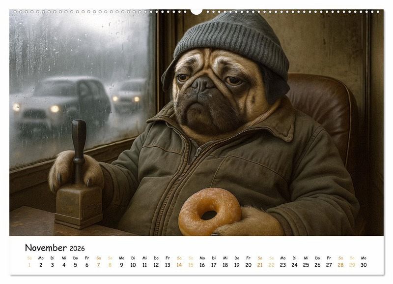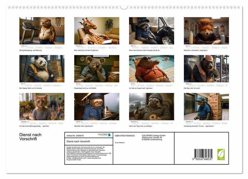Ob Brummbär auf Baustelle, müder Mops im Kassenhäuschen oder Waschbär im Lieferstress - dieser Kalender zeigt Monat für Monat tierische Kollegen bei ihrem ganz eigenen Arbeitstempo. Ultra-realistische, cineastische Tierporträts treffen auf stoische Gelassenheit, Müdigkeit und innerliche Kündigung mit Stil.