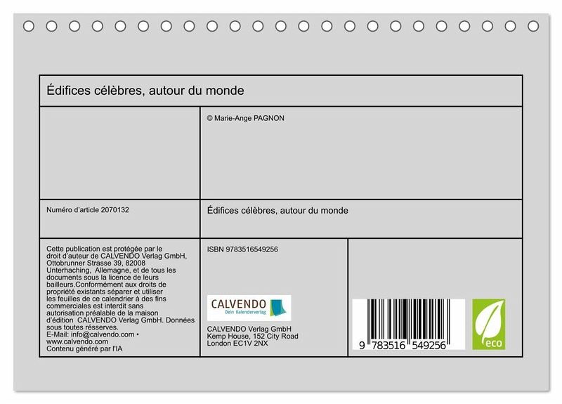 Chaque page de ce calendrier est une invitation à contempler des merveilles architecturales emblématiques. Laissez ces illustrations éveiller votre imagination et vous transporter dans des lieux légendaires empreints d'histoire et de grandeur. Ce calendrier vous transportera vers des horizons lointains et ravivera votre passion pour les voyages et la beauté artistique. Il ajoutera une touche d'art et d'élégance à votre quotidien et illuminera votre espace de vie.